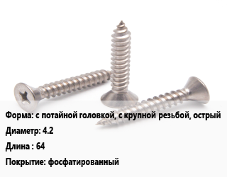 Саморез с потайной головкой, с крупной резьбой, острый D=4.2 L=64 фосфатированный, шт цена По запросу где купить, условия доставки в Таразе и Жамбылской области