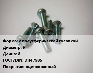 Винт с полусферической головкой 5х8 DIN 7985 оцинкованный, цена за 1000 шт,цена за шт, кг цена от 537.79 Тг / кг, где купить, условия доставки в Таразе и Жамбылской области
