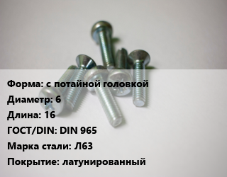 Винт с потайной головкой 6х16 DIN 965 Сталь: Л63 латунированный