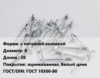 Заклепка с потайной головкой 8х28 оцинкованная, белый цинк ГОСТ: ГОСТ 10300-80