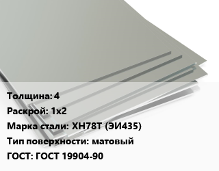 Лист нержавеющий 4 1х2 Сталь: ХН78Т (ЭИ435) Тип:матовый ГОСТ 19904-90